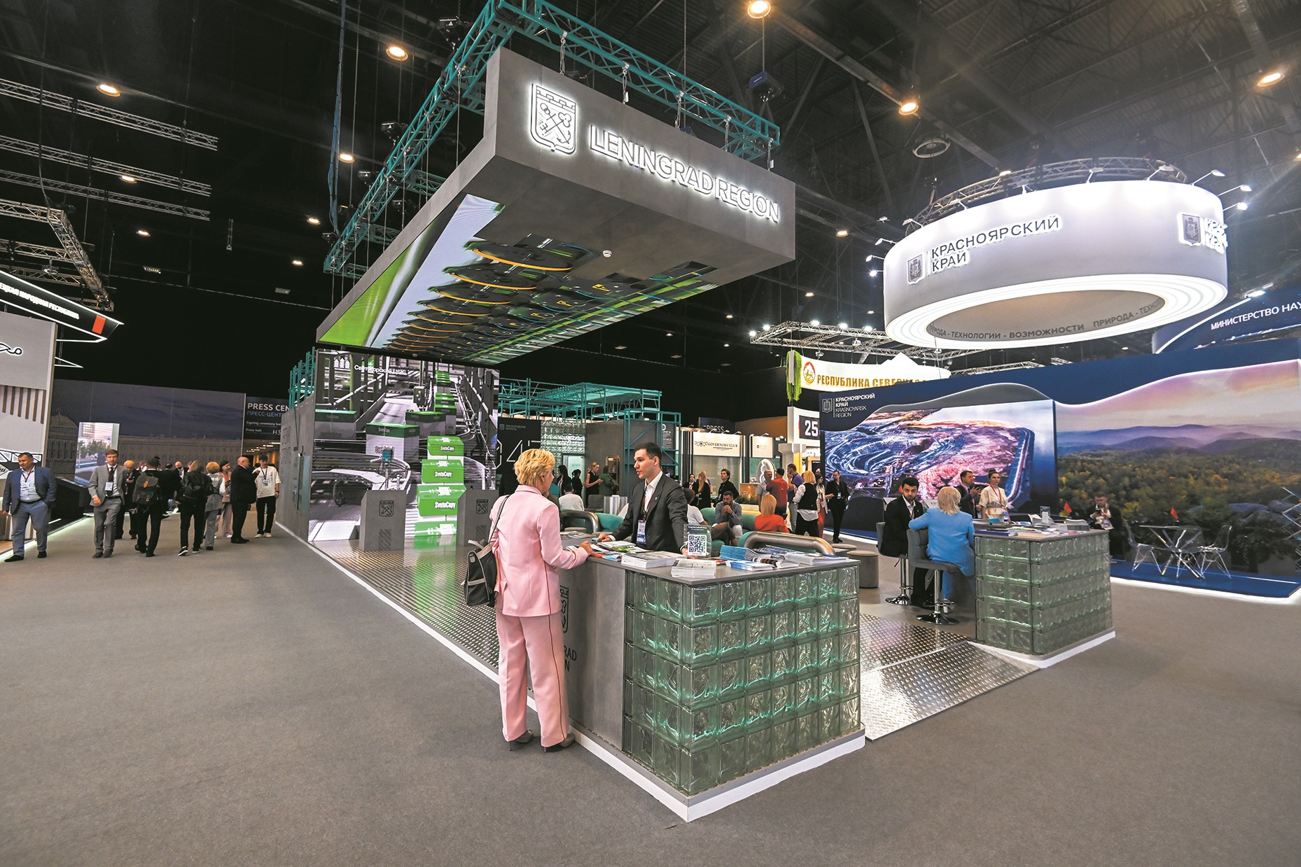 Стены и столы из серого бетона, сидения для гостей в виде стальных труб, плавящийся металл на мультимедийных экранах – в этом году стенд Ленинградской области на ПМЭФ-2024 был выполнен в индустриальном стиле. «Добро пожаловать на завод» – такими словами ленинградцы приветствовали гостей форума.
