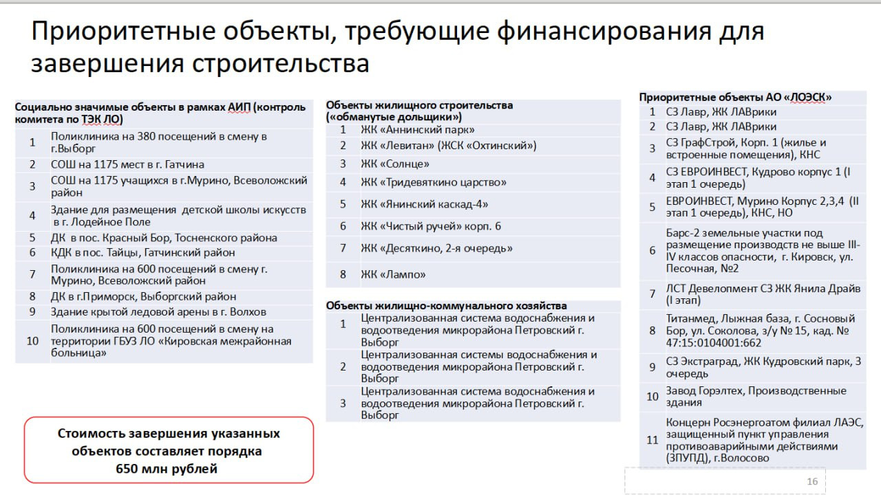 В правительстве Ленобласти 26 июня Александр Дрозденко провел совещание по кризисной ситуации в Ленинградской областной энергосетевой компании. У энергетиков не хватает средств на подключение к сетям 32 социальных объектов. 47news дает основные: ЖК обманутых дольщиков ("Аннинский парк", "Левитан", "Тридевяткино царство", "Янинский каскад-4", "Десяткино 2 очередь" и других); школ в Гатчине и Мурино (стройку последней курирует вице-премьер Хуснуллин); поликлиник в Кировске и Выборге. Один из участников совещания предоставил нам полный список.