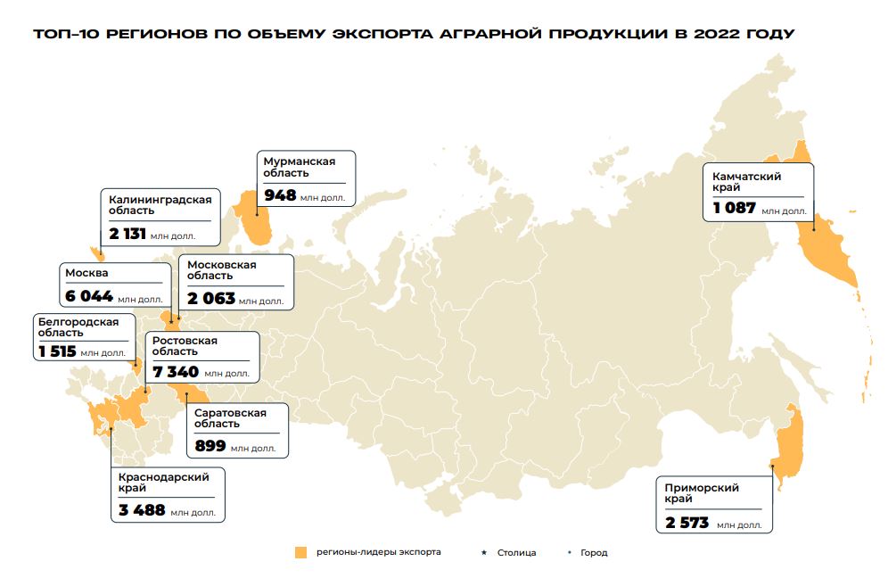 В исследовании отмечается, что 10 регионов России по итогам 2022 года обеспечили порядка 67,5% от общероссийского экспорта (или $28,1 млрд в стоимостном выражении). Это свидетельствует о сохранении тренда диверсификации поставок в региональном разрезе. В 2022 году пятерка лидеров осталась неизменной, в нее вошли: Ростовская область ($7,3 млрд), Москва ($6 млрд), Краснодарский край ($3,5 млрд), Приморский край ($2,6 млрд) и Калининградская область ($2,1 млрд). Стоит отметить, что попадание в список Москвы связано главным образом с тем, что крупнейшие зерновые трейдеры зарегистрированы на территории столицы России.