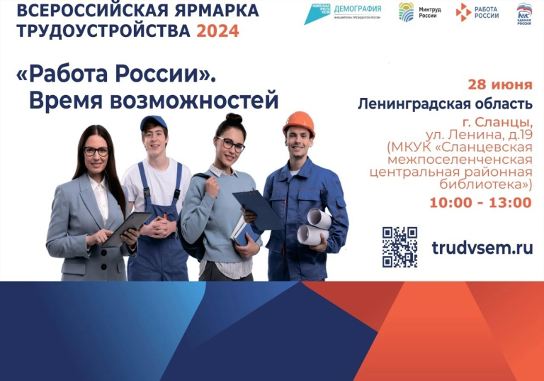 28 июня с 10:00 до 13:00 Сланцевский филиал ГКУ ЦЗН ЛО приглашает всех желающих на "Всероссийскую ярмарку трудоустройства «Работа России. Время возможностей", которая будет проходить на базе «Сланцевской межпоселенческой центральной районной библиотеки» по адресу: г. Сланцы, ул. Ленина, д.19