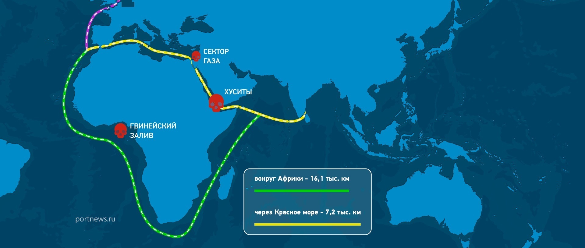 Отмечается, что компании, приостановившие судоходство по Красному морю (Maersk, Hapag-Lloyd, CMA CGM, and MSC), обеспечивают морскую перевозку 53% всех контейнеров в мире.