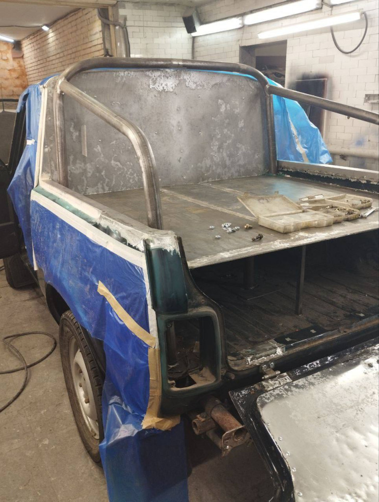 На опубликованном фото видно, что у машины переделывают кузов под пикап с поручнями. От водительского и пассажирского сидений заднюю часть отделяет металлический лист.
