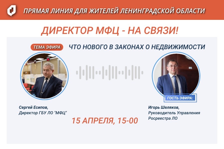 В понедельник, 15 апреля, с 15 до 16 часов, состоится очередной выпуск «Директор МФЦ - на связи!», в ходе которого для жителей Ленинградской области будет организована горячая линия с Управлением Росреестра по Ленинградской области. Жители региона могут обратиться с вопросом о регистрации недвижимости и получить развернутую консультацию.