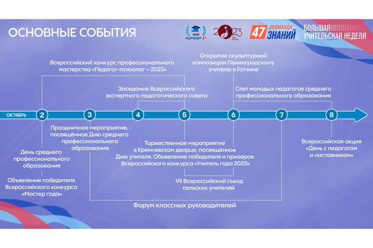 Так, 2 октября в Москве стартует Всероссийский конкурс профессионального мастерства «Педагог-психолог – 2023». Ленинградскую область представляет Валерия Верина из Межшкольного учебного комбината Киришского района. Также в этот день отмечается День среднего профессионального образования. В колледжах и техникумах региона запланированы различные акции, мастер-классы и флешмобы.