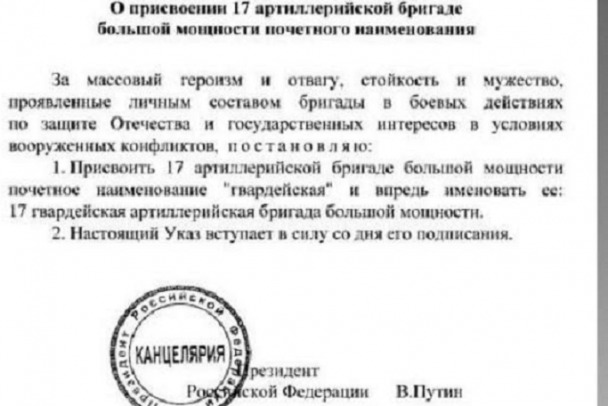 Владимир Путин 4 марта подписал указ о присвоении почётного наименования 17 артиллерийской бригаде большой мощности вооружённых сил России. Согласно документу бригада получила наименование "гвардейская".