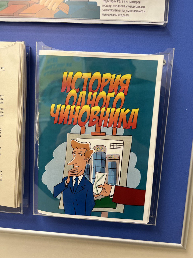 Выходных данных на этом экземпляре, к сожалению, нет, но, с учётом расположения самого комикса, скорей всего, он оказался здесь, потому что так положено, возможно, какой-нибудь федеральной программой по борьбе с коррупцией. Возможно, областным чиновникам было бы интереснее почитать более доступные примеры, к примеру, из жизни своих коллег.