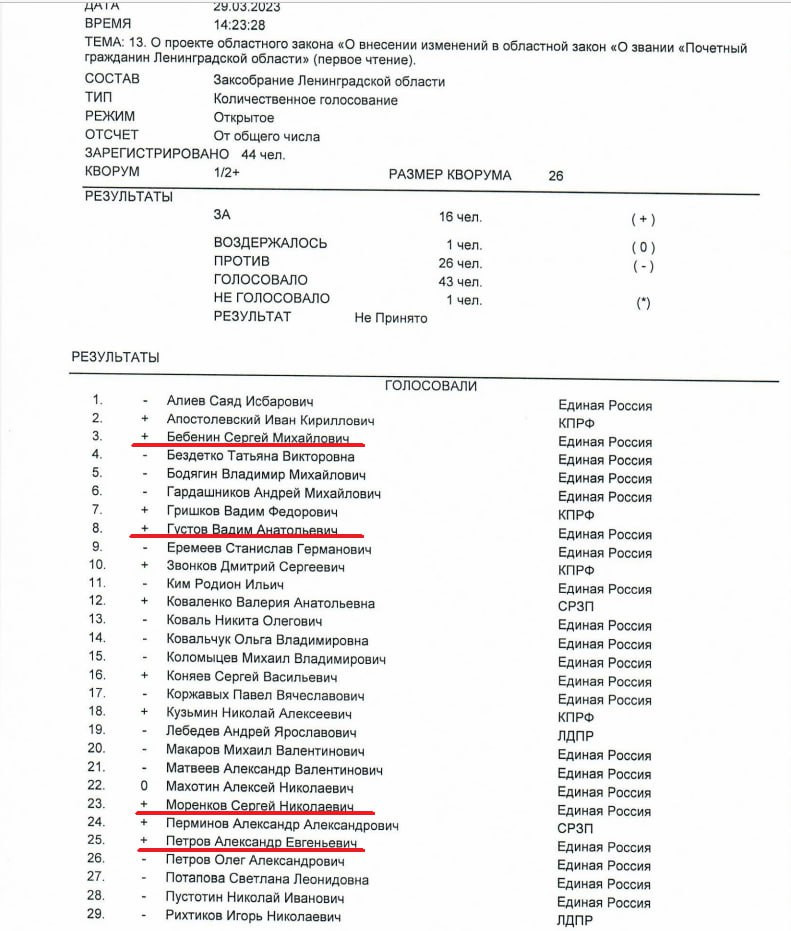 Всё описанное осталось бы новостью, если бы не данные результатов голосования. В распоряжении 47news оказался список поимённого нажатия кнопок по данному законопроекту.