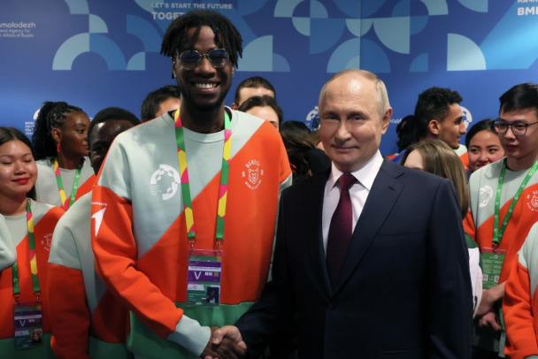 "Мне тоже надо такую прическу сделать", - с улыбкой сказал Путин во время фотографирования со студентами, указав на дреды участника фестиваля из Нигерии.