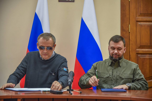 Губернатор Ленобласти и глава ДНР Денис Пушилин в декабре 2023 года подписывают соглашение об оказании шефской помощи Енакиево и Мариуполю Фото: