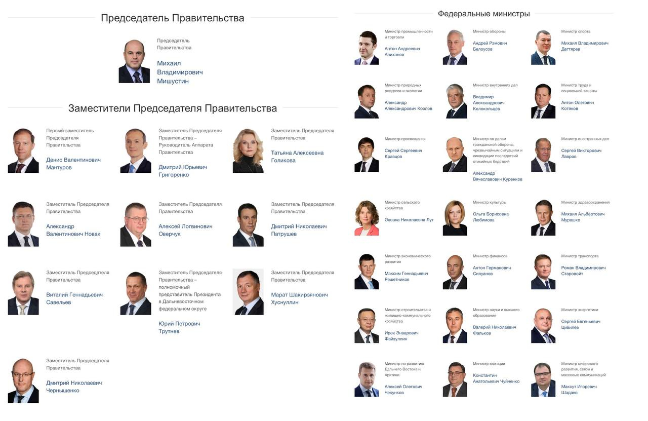 В общей сложности в правительство, помимо его руководителя, входит 10 вице-премьеров и 21 министр. Количество и название министерств не поменялись, если сравнивать с предыдущим составом.