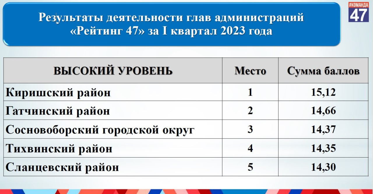 Во время заседания правительства Ленобласти в четверг, 29 июня, была обнародована информация об оценке результативности деятельности глав администраций районов за первый квартал 2023 года.