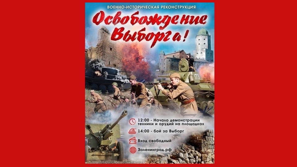 - 14.15 – военно-историческая реконструкция Выборгской наступательной операции «Освобождение города Выборга». Продолжительность – 45 минут. Просьба сохранять спокойствие.