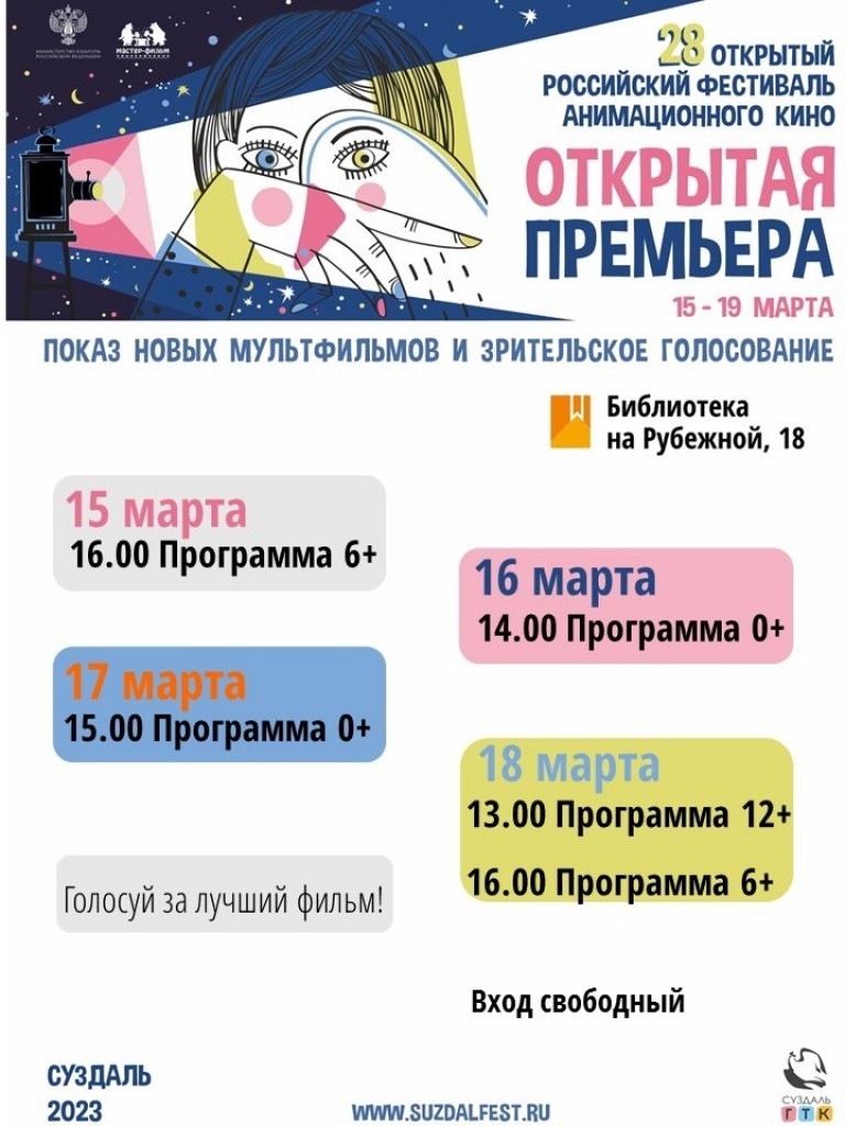 Открытый российский фестиваль анимационного кино пройдет в Суздале с 15 по 19 марта. Для детей разных возрастов подготовлено пять программ короткометражных мультфильмов. Важной частью акции является зрительское голосование за лучший фильм фестиваля - ведь мнение публики для любого автора не менее важно, чем оценка профессионального жюри.