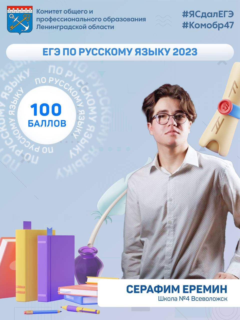 Два стобалльника в этом году во Всеволожске – это Серафим Еремин из школы №4 и Виктория Есина из школы №6. В Сосновом Бору блестящий результат показали Анна Руднева из Лицея №8 и Марк Гредасов из школы №3. На максимум ЕГЭ также сдали Карина Казарина из Бокситогорской школы №2, Олег Орлов из школы №1 города Волосово, Алиса Карпович из Волховской гимназии №3, Анна Валентионок из школы №1 Сертолово, Ксения Сергеева из школы №10 Выборга и Анжелика Торопова из Гимназии города Кириши.
