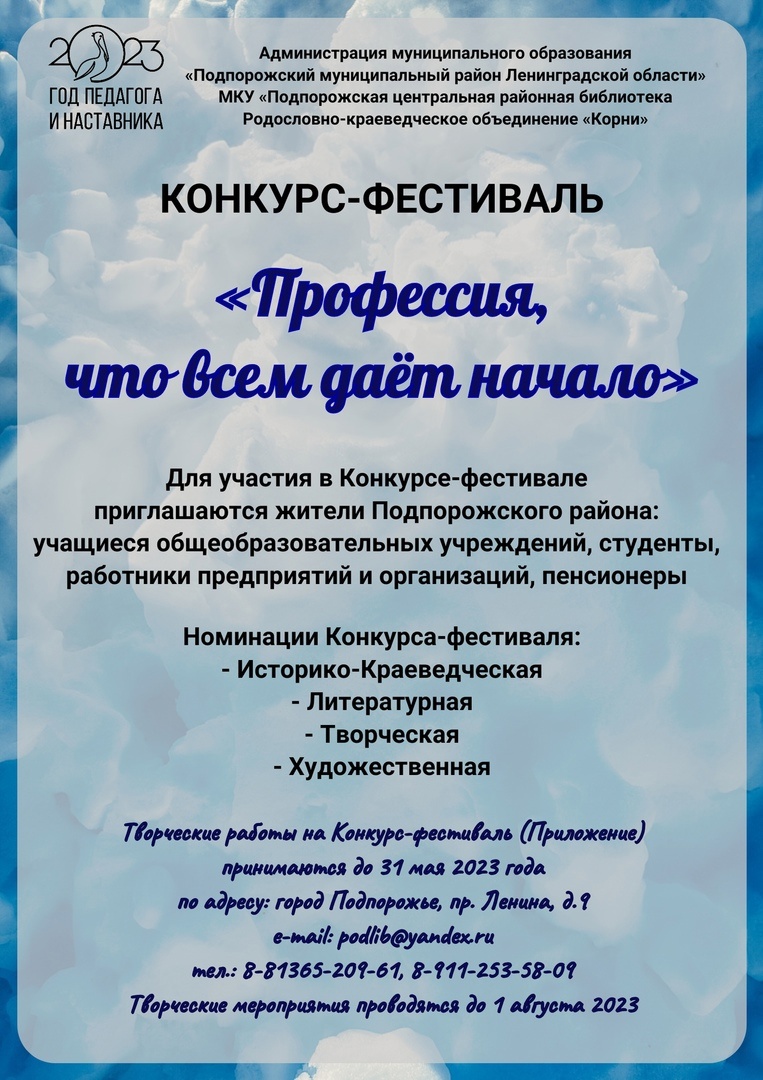 Дорогие друзья! Приглашаем вас принять участие в Конкурсе-фестивале творческих работ «Профессия, что всем даёт начало», посвящённом Году педагога и наставника.
