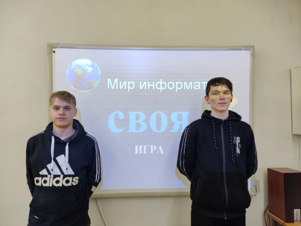 Обучающиеся группы ТД – 5, ПК – 2, ПД – 1, № 269, № 271 соревновались в играх «Своя игра 1», «Своя игра 2», в викторинах «Умные наноигроки», «В мире информатики». Большее количество баллов в играх набрали обучающиеся: Алексеева Кристина (группа 270), Захаров Александр, Фомичев Илья (группа № 271), Гаврилов Никита, Карасев Кирилл (группа ТД – 5), Иванов Евгений, Быстров Илья, Костин Николай (группа ПК – 2), Глебов Кирилл (группа № 269), Горохова Анастасия (группа ПД – 1).