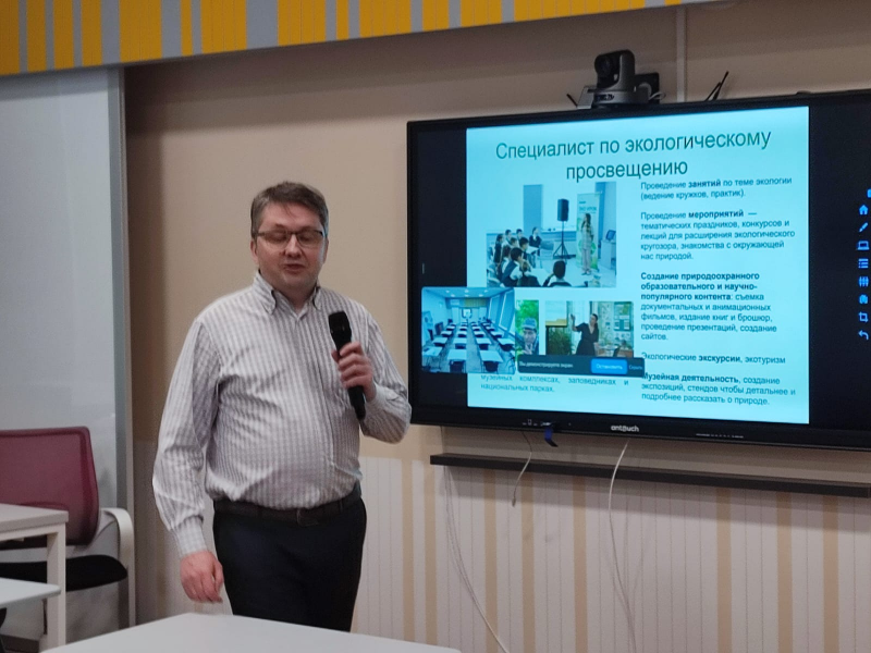 На этот раз нашим спикером был педагог-организатор Центра экологического образования ДДЮТ Леонид Владимирович Константинов. Он является ведущим профориентационных семинаров, проводимых в рамках муниципального проекта «Билет в будущее». Благодаря этому проекту обучающиеся узнают о самых разнообразных профессиях, объединённых экологической проблематикой.