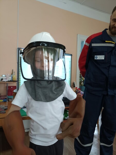 Потом ребята дружно примеряли каску, диэлектрические перчатки и боты!