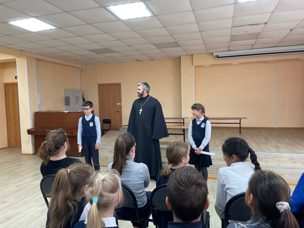 Иерей Георгий Солтанязов , настоятель Борисоглебского храма массива Мертуть, провёл для учеников 4-х классов занятие по теме "Добрые дела". Ребята смогли стать гостями импровизированной "телепередачи", вести которую священнику помогали их одноклассники-"репортёры".