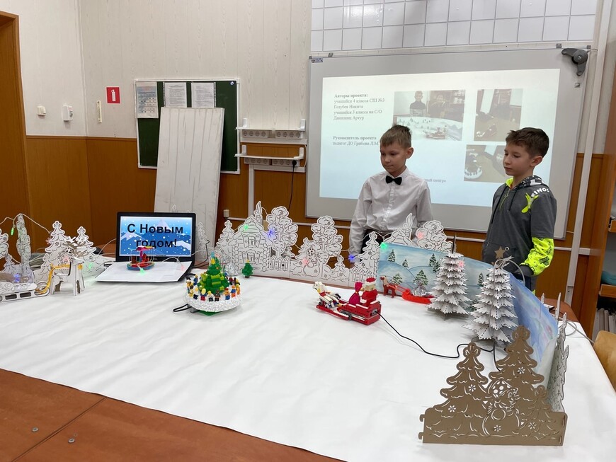 Учащийся 4 класса средней школы №3 Никита Голубев и учащийся 3 класса С/О Артур Данилянц победили в конкурсе проектов робототехнического творчества "Новый год и Рождество в эпоху технологий" в номинации "Робототехнические конструкторы. Творческий проект. Возраст 7-10 лет"