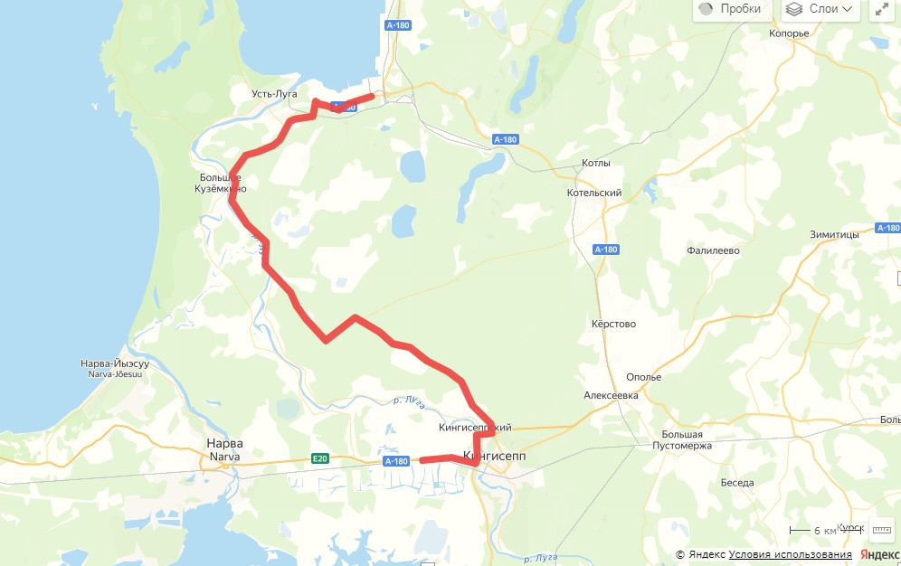 Перевозка будет осуществляться по следующему маршруту - территория МТП Усть-Луга - а/д А-180 "Нарва" подъезд к деревне Лужицы - а/д 41К-109 "Лужицы - Первое Мая" - а/д 41К-005 "Псков - Гдов - Сланцы - Кингисепп – Краколье" - а/д А-180 "Нарва" (124 – 133 км Промзона Еврохим Фосфорит).