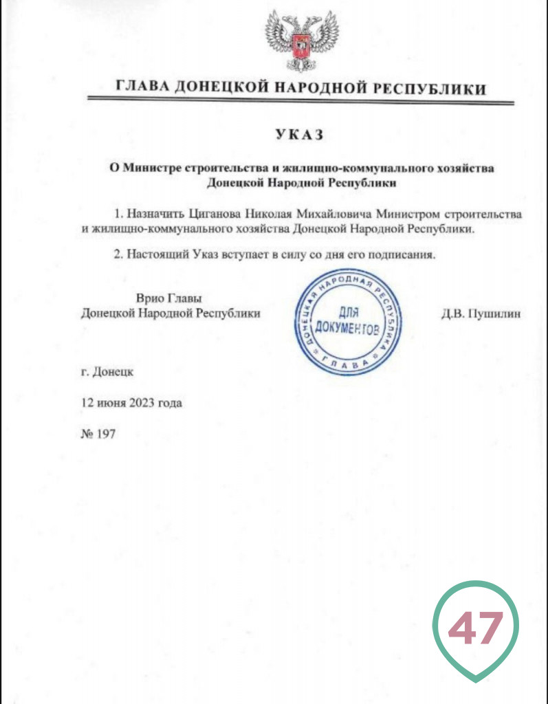 Как стало известно 47news, врио главы ДНР Денис Пушилин в понедельник, 12 июня, подписал указ о назначении Николая Циганова министром строительства и ЖКХ республики. Действие указа начинается со дня его подписания.