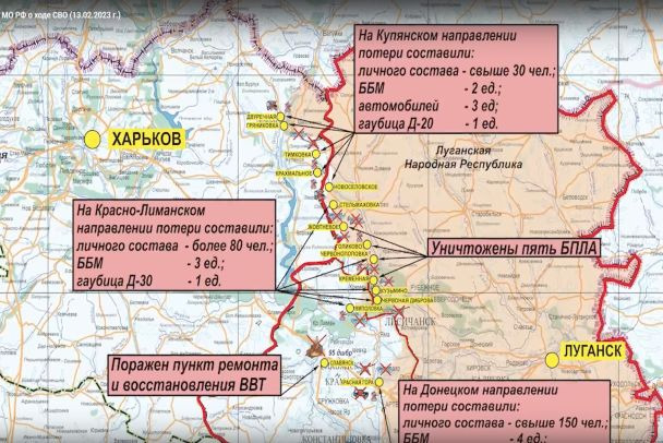 По данным ведомства, украинская сторона за сутки потеряла на этом направлении 150 военнослужащих, четыре боевые бронемашины, шесть пикапов и две гаубицы Д-30.