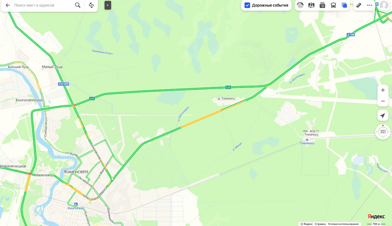 Судя по данным сервиса "Яндекс.Пробки", в сторону Кингисеппа движение затруднено на протяжении 1,5 км, а в обратном направлении — на протяжении 2 километров.