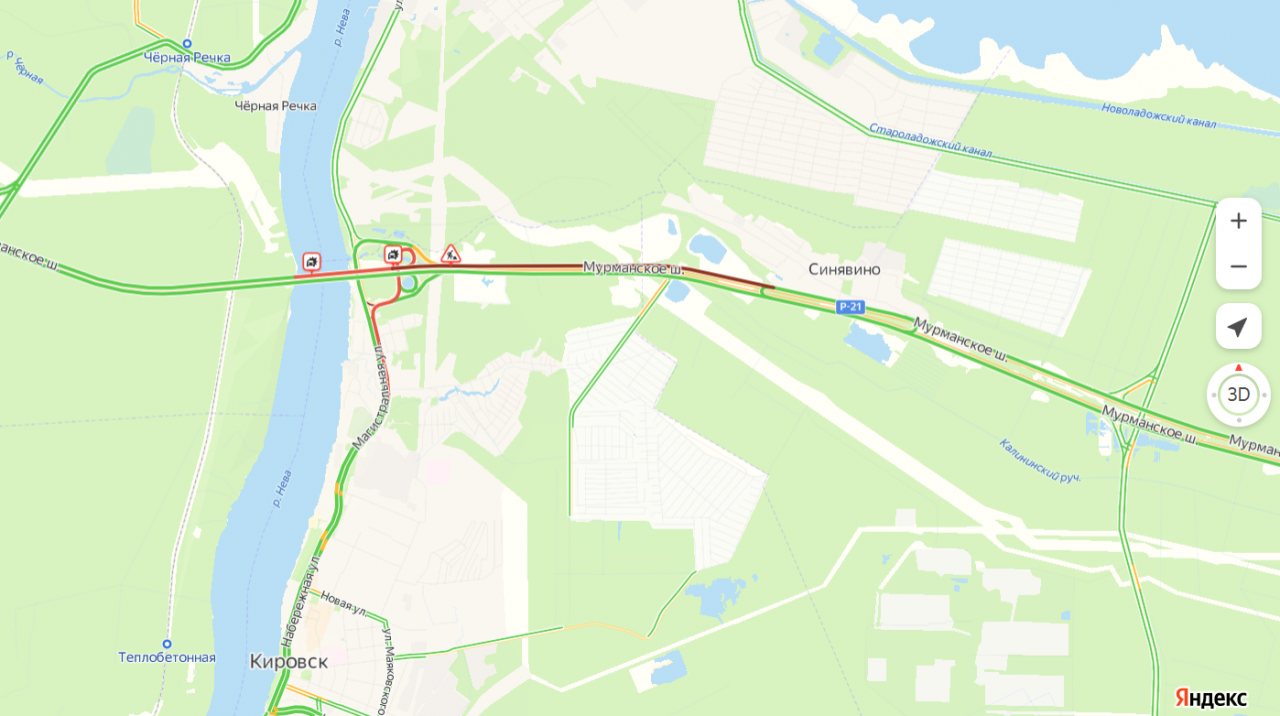 "Багровые" пробки зафиксированы на участке федеральной трассы "Кола" в Кировском районе Ленобласти, где накануне грузовик потерял часть прицепа.