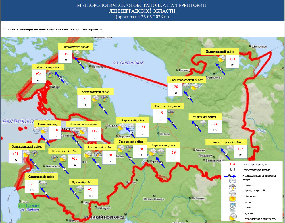 Облачная с прояснениями погода прогнозируется в Ленинградской области в понедельник, 26 июня.