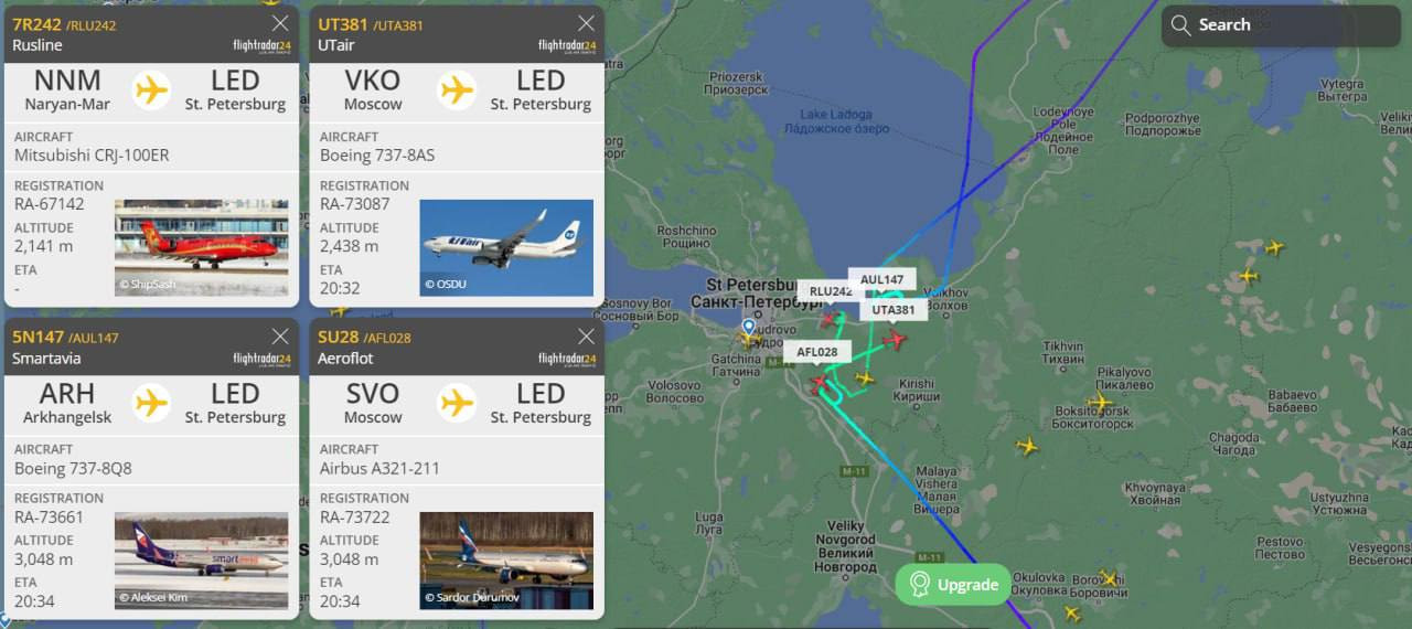 Траектории их полётов зафиксировал Flightradar24. Это два рейса из Москвы, борта из Самары, Нарьян-Мара, Архангельска и даже из Дубая.