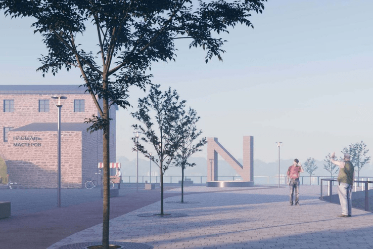 Ивангородская крепость с замком Германа отразятся в изготовленных из камня и бетона малых архитектурных формах. Входную группу украсят стенки-габионы, а элементы мощения и фасады навеса – мотивы работ художника Ивана Билибина.
