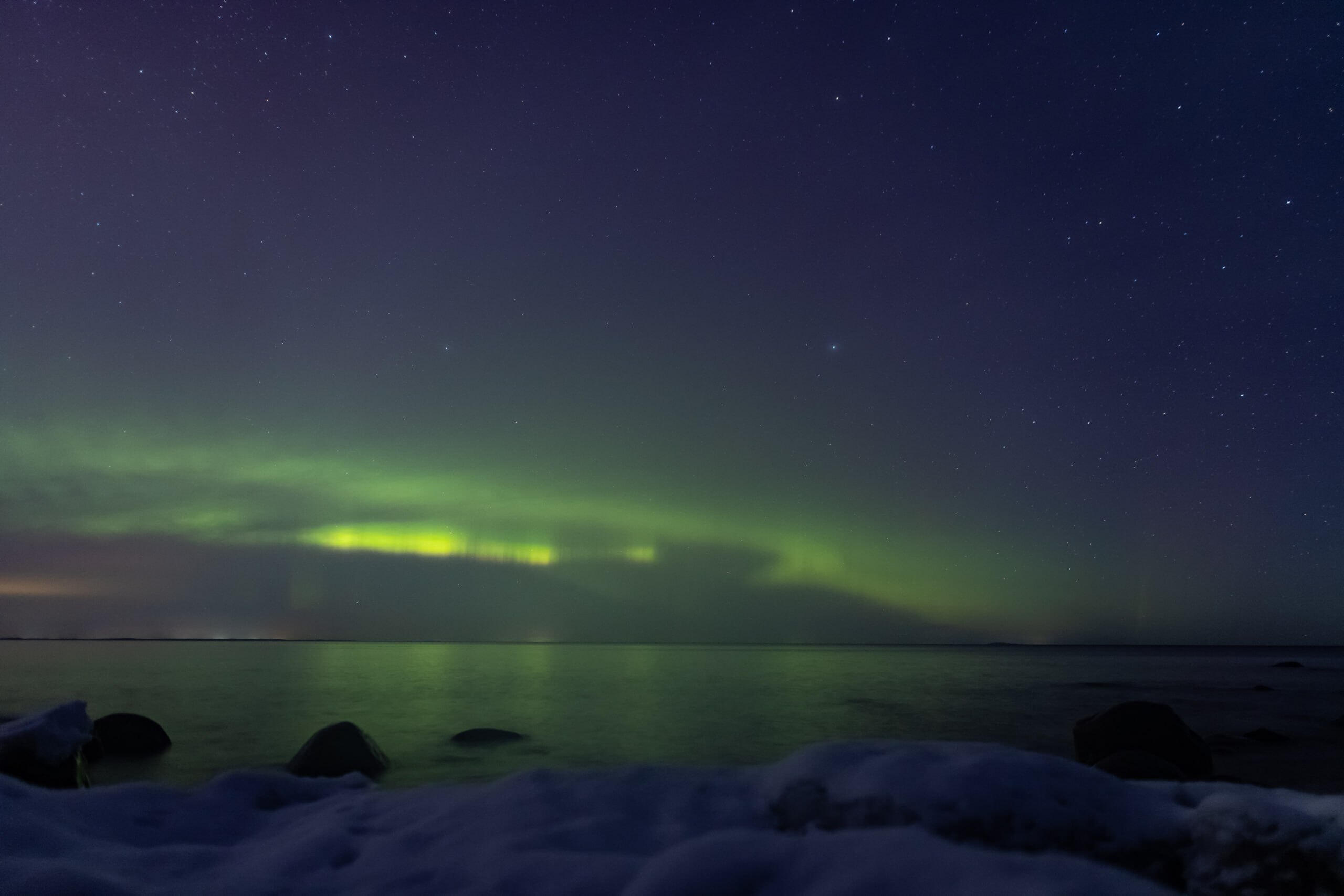 «Сияние отражалось в воде, волны набегали на озере, словно морской прибой. Вот только пока пляж скован льдом, а вместо песка – снег», – рассказали в посте.