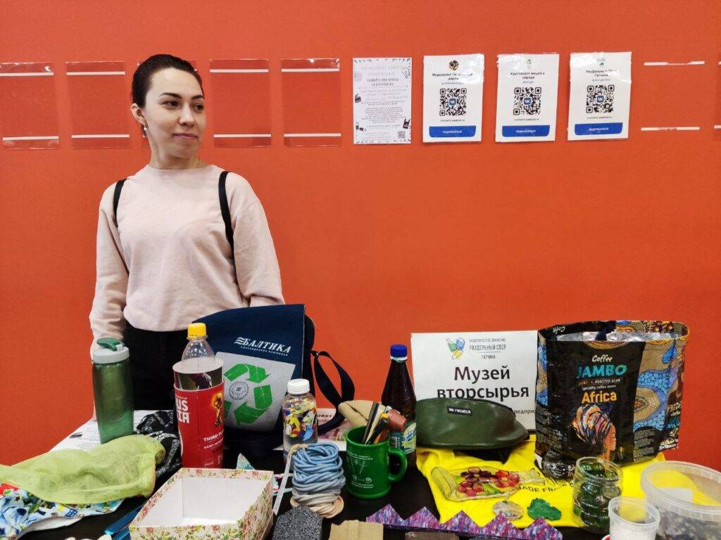 Помещение условно поделено на секции. С первой я познакомился, далее — “Музей вторсырья”. Это удивительная и увлекательная история переработки разных материалов, как доказательство — полезные и приятные глазу результаты переработки. Экскурсоводом настольного музея выступила волонтёр “РазДельного Сбора Гатчины” — Милла Крушельницкая: “Мы рассказываем о том, что переработка в нашей стране существует, заводы работают. Волонтёры “РазДельного Сбора” регулярно приезжают на экскурсии на эти заводы, берут экспонаты и знакомятся с техникой переработки сырья, которое сдают на наших акциях, что из этого сырья получается в дальнейшем, как оно может быть использовано. У нас представлено сырьё до переработки, результаты переработки, сырьё извлечённое из процесса переработки”.