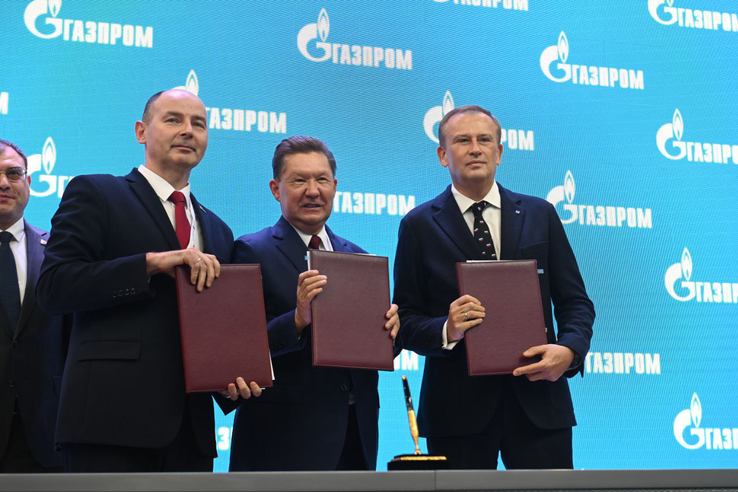 Губернатор Ленинградской области Александр Дрозденко, председатель правления ПАО «Газпром» Алексей Миллер и министр энергетики Республики Беларусь Алексей Кушнаренко подписали меморандум на Петербургском международном газовом форуме.