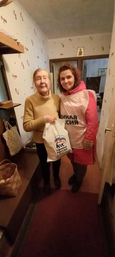 Глава поселения Марина Кюне вместе с активистами местного отделения партии навестили пенсионеров на дому и вручили им памятные подарки.