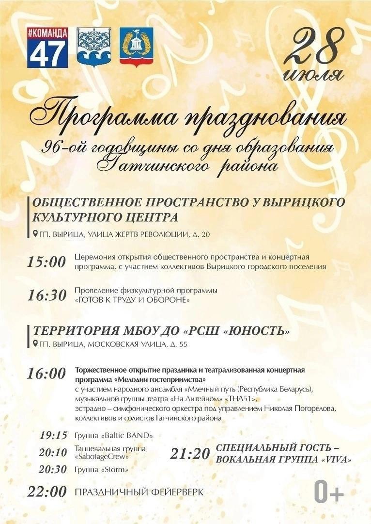 Приглашаем вас на праздничное мероприятие, посвященное 96-ой годовщине со дня образования Гатчинского района!