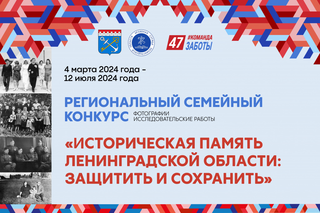 В соответствии с распоряжением Губернатора Ленинградской области от 29 декабря 2023 года № 1096-рг «О проведении в 2024 году в Ленинградской области Года Команды Заботы» Архивное управление Ленинградской области совместно с Ленинградским областным отделением Общероссийского общественного благотворительного фонда «Российский детский фонд» проводит региональный семейный конкурс «Историческая память Ленинградской области: защитить и сохранить».