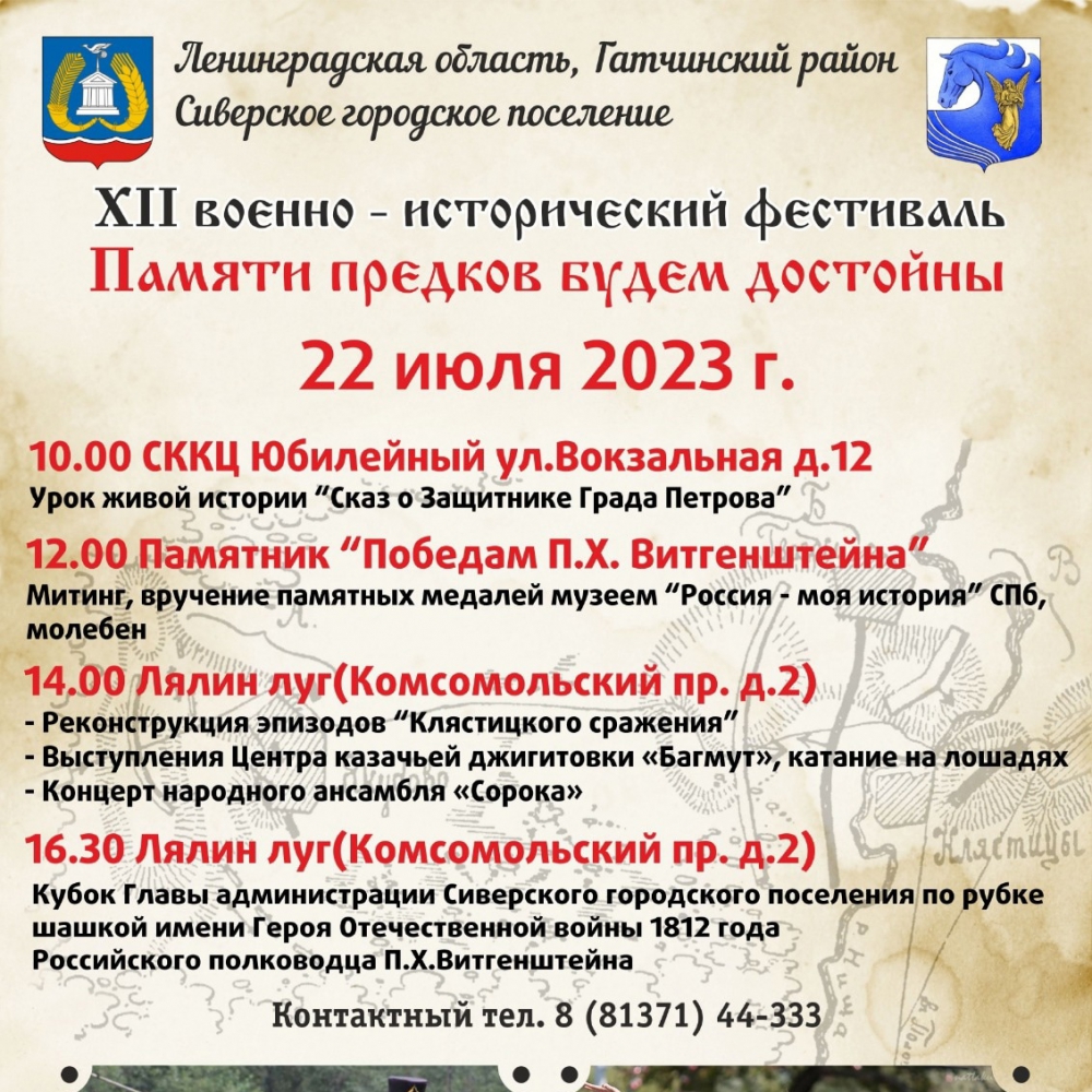 22 июля в поселке Сиверский пройдет ежегодный XII военно-исторический фестиваль «Памяти предков будем достойны», одним из главных событий которого будет реконструкция Клястицкого сражения.