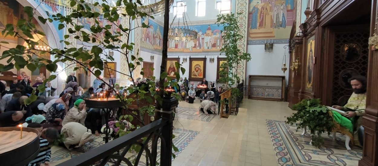 По окончанию Литургии по Уставу была совершена Великая Вечерня с коленопреклонными молитвами. Храм был украшен зелеными ветвями в знак животворного действия Святаго Духа.