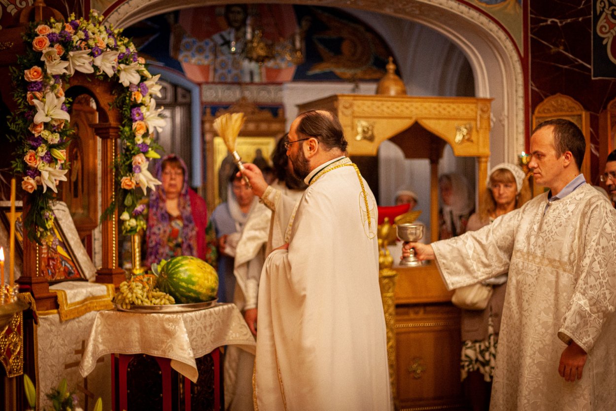 После Литургии было совершено освящение начатков урожая, по традиции принесенных в храм прихожанами.
