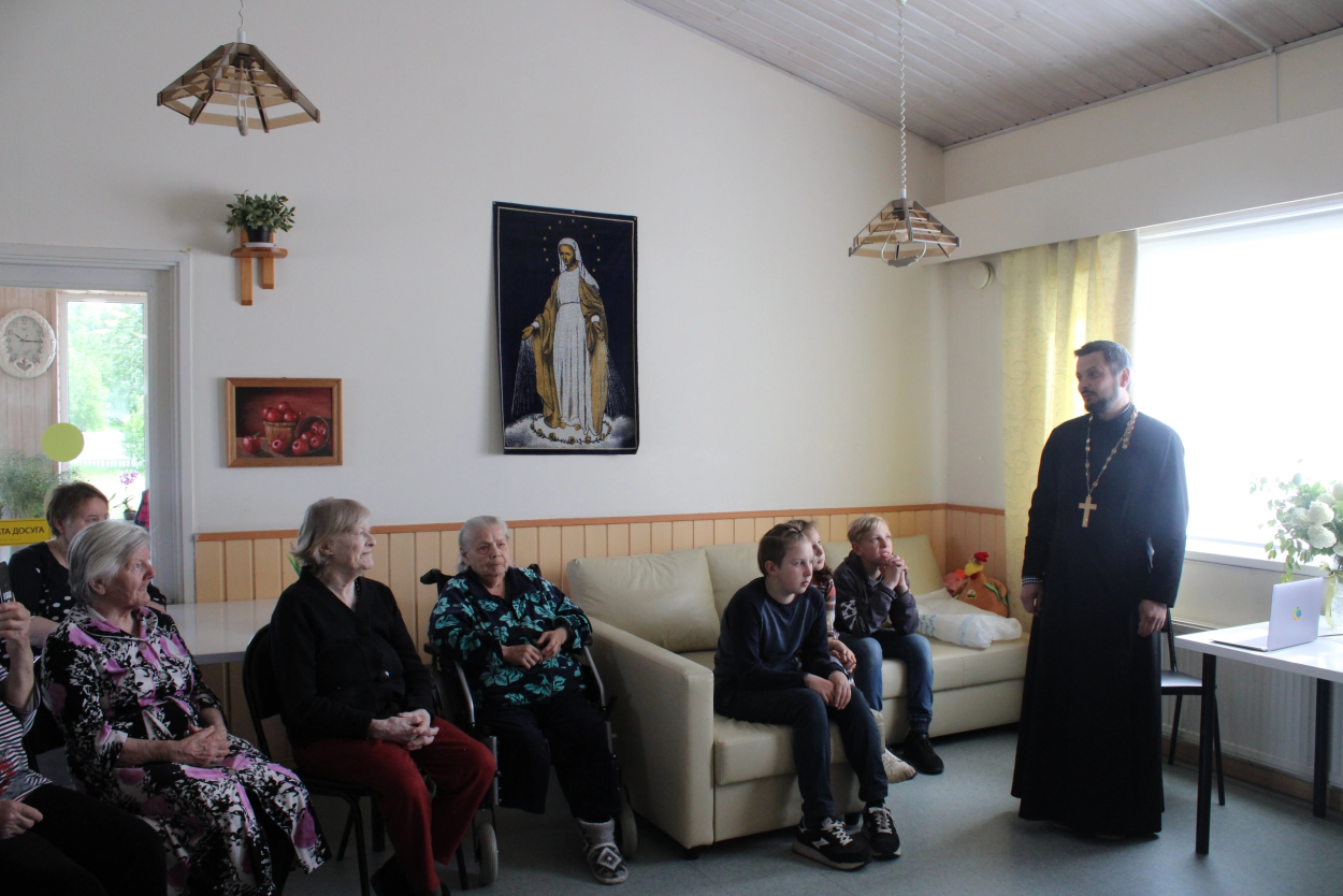 В праздник Святой Троицы настоятель храма Богоявления Господня п.Разметелево иерей Сергий Ломакин с учениками воскресной школы и учениками Разметелевской СОШ из Центра "Точка роста" посетили пансион для пожилых людей в д.Колбино.