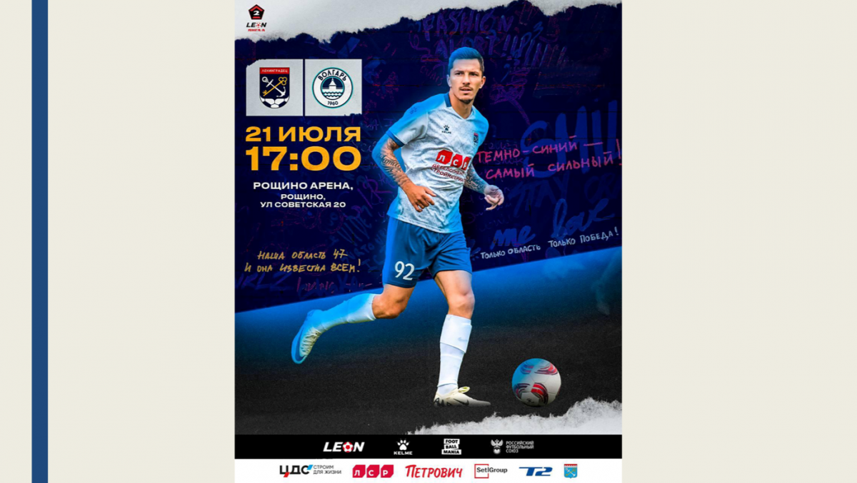 В это воскресенье, 21 июля, на стадионе «Рощино Арена» пройдёт матч в рамках LEON-второй лиги первенства России по футболу между командами «Ленинградец», представляющей 47 регион, и «Волгарь» из Астрахани. Начало игры в 17.00.