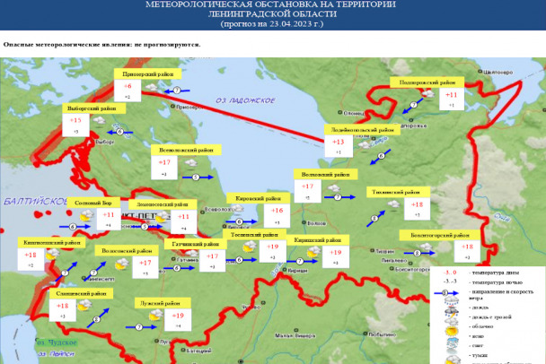 Как передает пресс-служба ГУ МЧС России по Ленобласти, второй выходной день на этой неделе, 23 апреля, будет отмечен переменной облачностью и отсутствием осадков. Ночью будет дуть переменный ветер — пять метров в секунду, а днем — западный, юго-западный, 3-8 м/с.