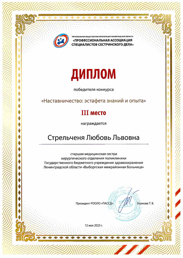 12 мая 2023г. во Дворце искусств Ленинградской области прошло торжественное мероприятие, приуроченное к Международному Дню Медицинской Сестры. Лучших специалистов в профессии наградили благодарностями губернатора, Законодательного собрания Ленинградской области и грамотами от Комитета по здравоохранению ЛО.