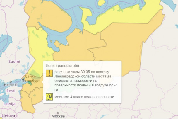 По данным Гидрометцентра России, на востоке Ленинградской области после полуночи и до 6:00 утра вторника, 30 мая, ожидаются заморозки на поверхности почвы и в воздухе до минус 1 градуса. В связи с неблагоприятной обстановкой объявлен оранжевый уровень опасности. Отметим, к восточным районам относятся: Киришский, Волховский, Лодейнопольский, Тихвинский, Подпорожский и Бокситогорский.