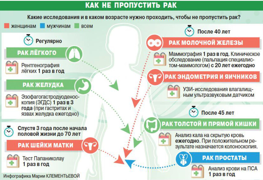 РЕГУЛЯРНОЕ МЕДИЦИНСКОЕ ОБСЛЕДОВАНИЕ Для профилактики возникновения некоторых видов рака, таких как рак молочной железы, толстой кишки и матки, рекомендуется проходить регулярные обследования: маммография — каждый год, начиная с 40-летнего возраста; колоноскопия — каждые 5-10 лет, начиная с 50-летнего возраста; цитологическое исследование мазка — каждый год, начиная с 21-летнего возраста. При этом важно помнить, что данные рекомендации являются общими. В зависимости от некоторых других обстоятельств, таких как семейный анамнез или наличие факторов риска, некоторым людям необходимо начать скрининг в более раннем возрасте или проходить обследование чаще либо наоборот реже.