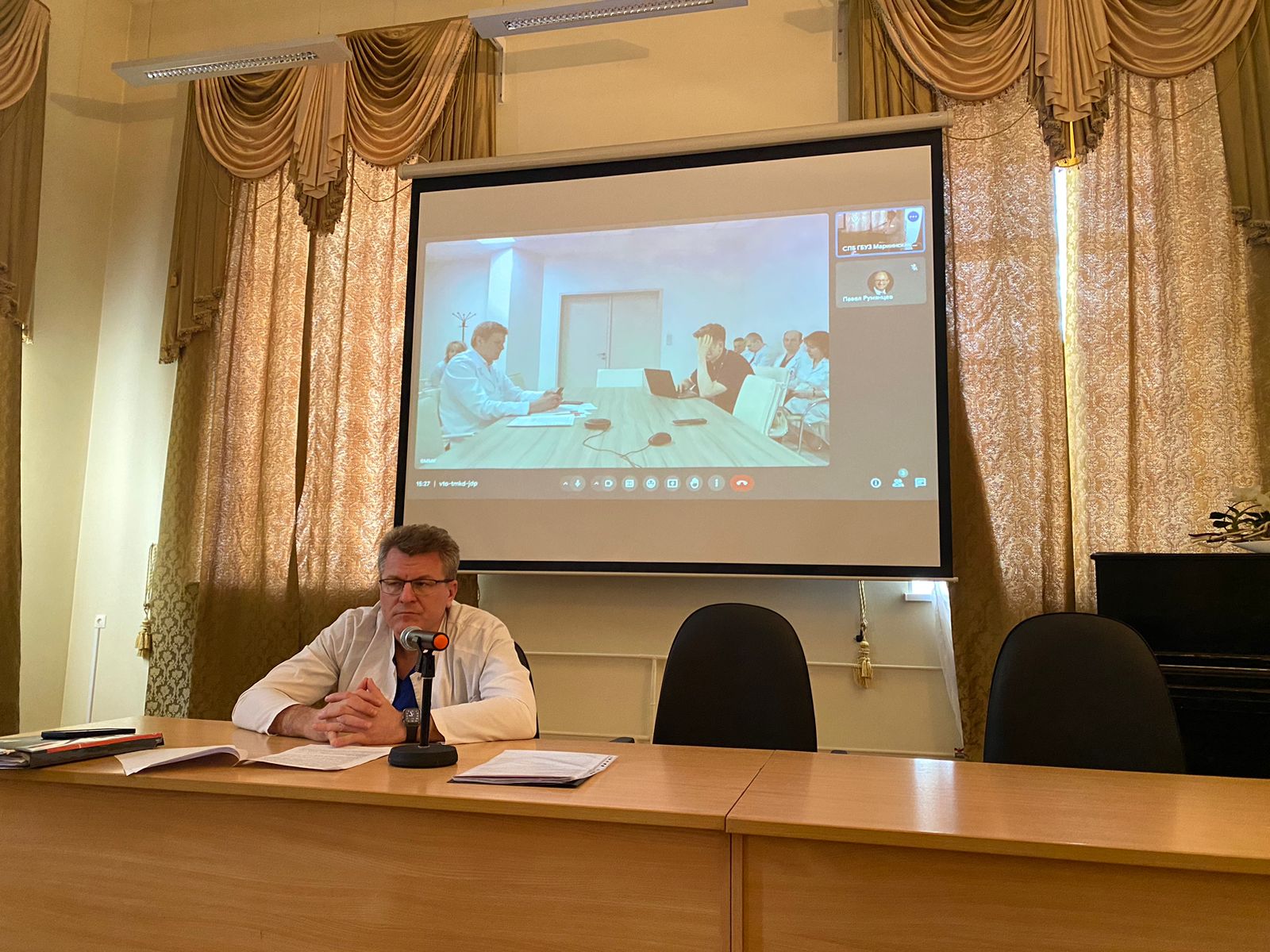 Заседание по случаю анализа оказания медицинской помощи пациенту прошло в формате видеоконференции под председательством заместителя главного врача по хирургии Мариинской больницы Ивана Анатольевича Соловьёва и при участии представителей медицинского центра «Белоостров» во главе с главным врачом, д.м.н., профессором Анатолием Анатольевичем Завражновым.