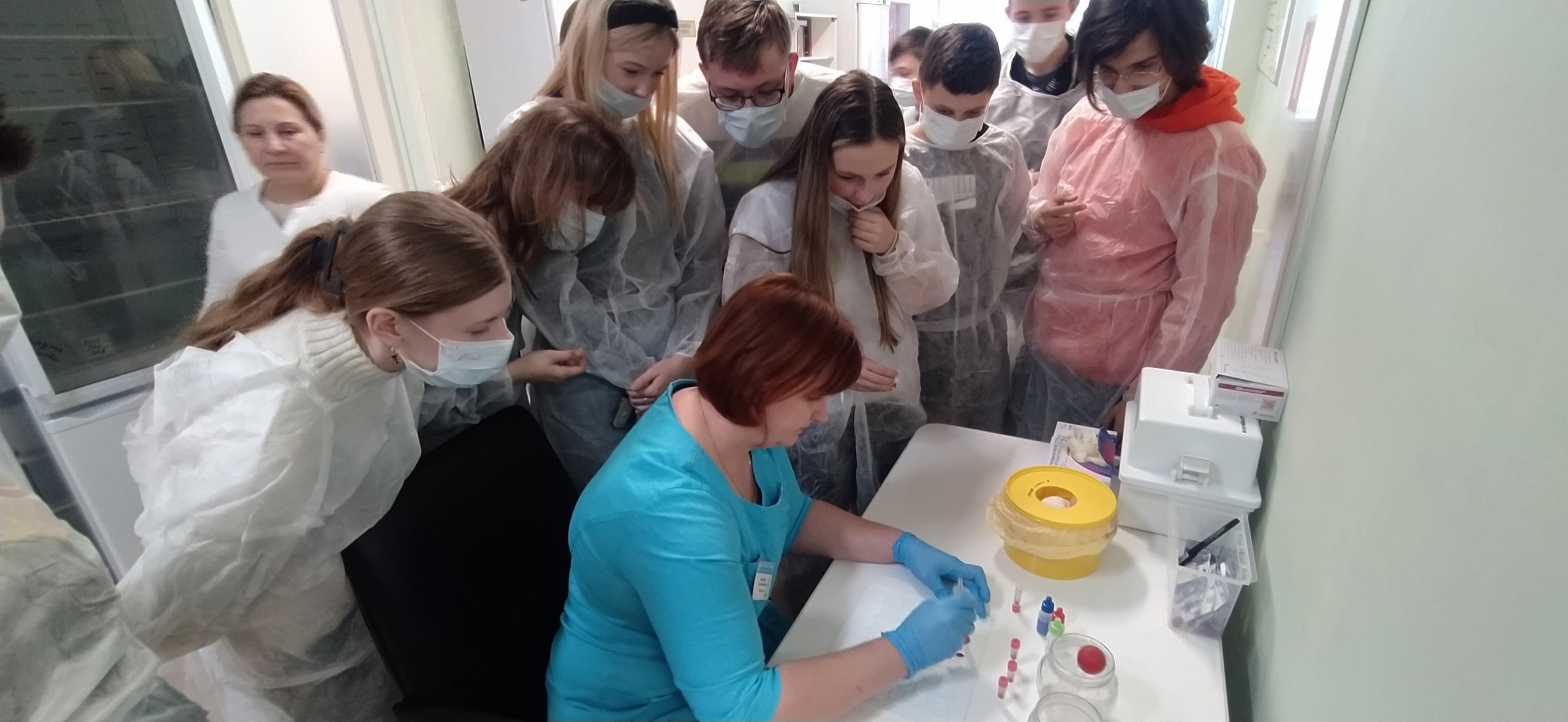 Как рассказали в пресс-службе Гатчинской КМБ, заведующая клинико-диагностической лабораторией Елена Аплина провела ребят по кабинетам, рассказала, какая работа и каким образом выполняется в каждом. Школьникам показали работу различных приборов, процесс исследования элементов крови и биологических жидкостей человеческого организма. Ребята вспомнили важные для жизнедеятельности гормоны, витамины и ферменты, а желающие поучаствовали в определении группы крови.