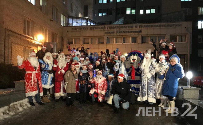 Больше ста Дедов Морозов собрались во дворе Клиники «НИИ детской онкологии, гематологии и трансплантологии им. Р.М.Горбачевой», чтобы поздравить ребят с наступающим Новым годом.